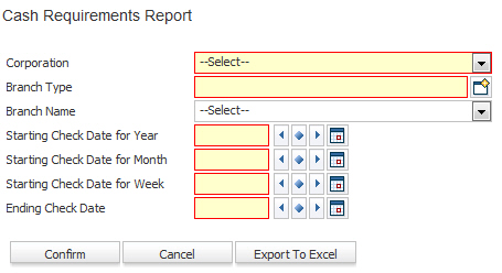 4) 4) The Cash Requirements Report criteria window displays. After selecting your criteria, click Confirm to generate the report or Export to Excel to open the report as a .csv file.