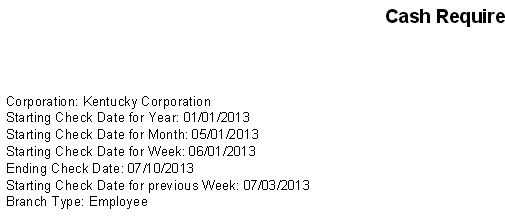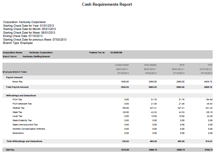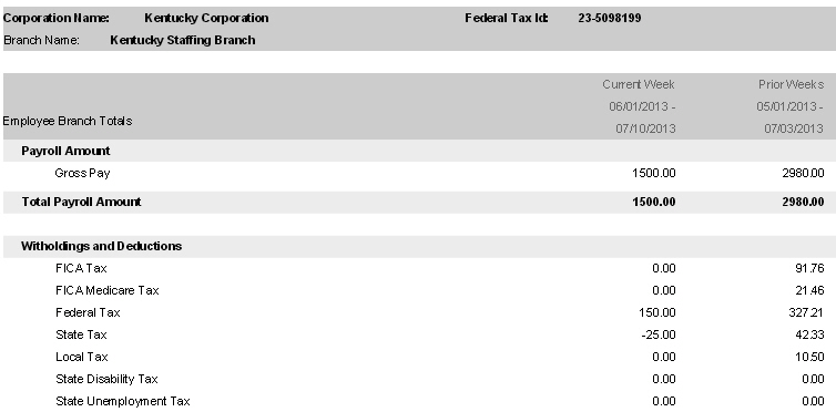 This report provides current week, previous weeks, month-to-date and year-to-date summary financial totals related to your monetary responsibility - grouped and subtotaled by branch and corporation. It lists Total Pay, withholdings by category, deductions and employer costs for the sales posting dates (or check dates) entered.