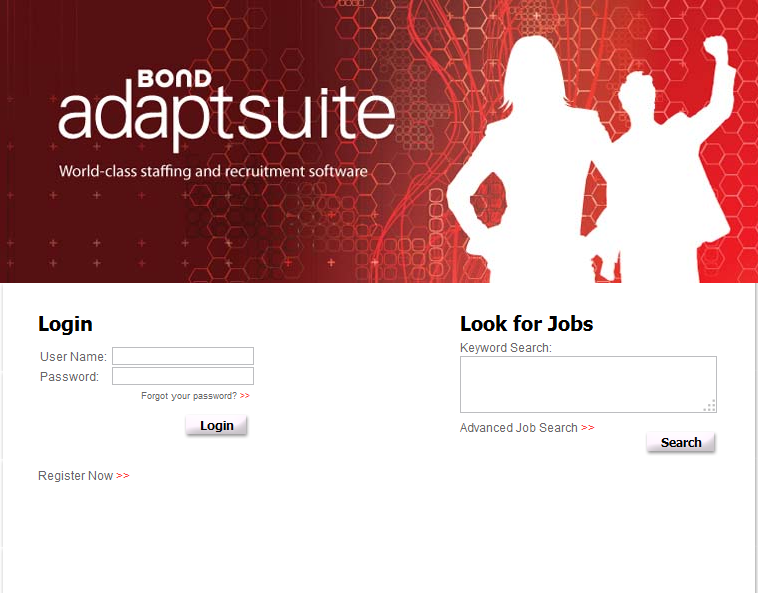 The login page allows the user to access Adapt Web Services, recover their password, complete a candidate registration and search for a job.