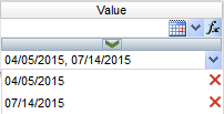Multiple Values: To select multiple values, click the desired icon on the top field to select a date to add to the list. You can also type the date and click the middle arrow to add it to the list. To see the items on the list, click the lower droplist. To remove an item from the list, click the red X to the right of the item.