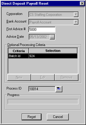 The first advice number in the direct deposit process. You may edit this field if you do not want all of the advices reset in the process. If this is the case, simply enter the first number of the advices you DO want reset. |