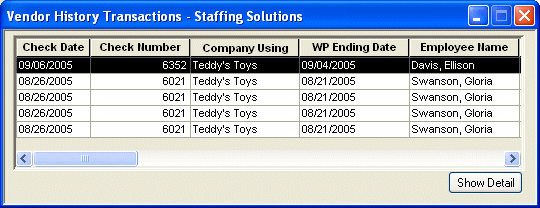 To get detailed information about the check paid to the vendor for a transaction, select the transaction from the list and click the Show Detail button. The Vendor History Check Detail window displays.
