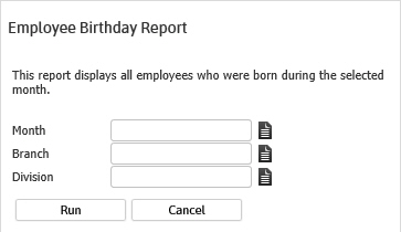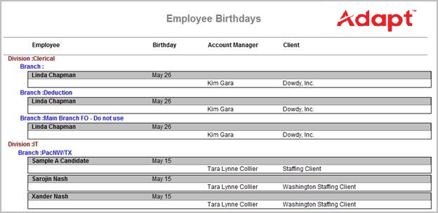 The employee birthday report is used to track birthdays for active candidates; this is a month/day listing.