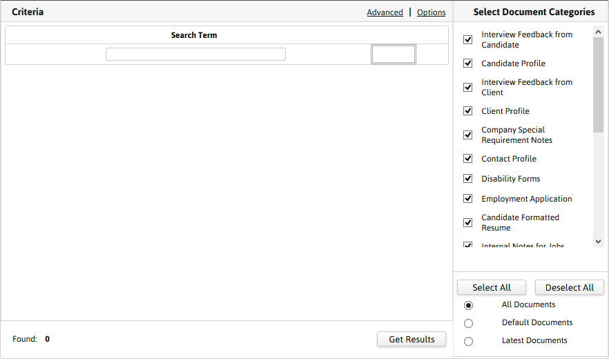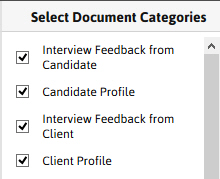 - Default Docs – searches only the default documents in the selected categories. For example, when adding an original resume in a candidate's record via the document library, right click on the document and select "default". As a result, the original resume that has this option applied will be searched providing that the category above has been selected.
