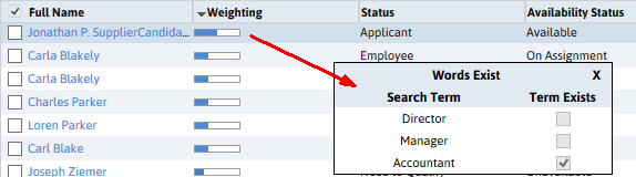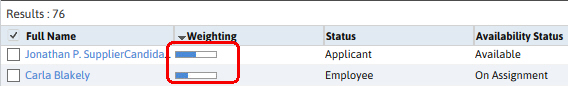 A score is applied to the search results in order to easily see which results most closely match entered criteria. To see the score and breakdown, you will need to have the weighting value displayed on the reformatted search result screen.