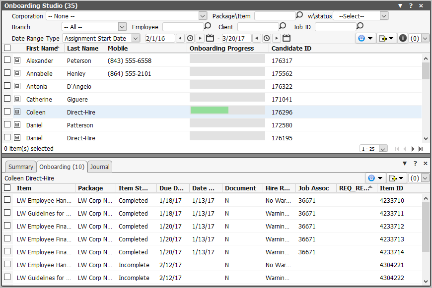 Onboarding: Displays any onboarding items currently on the Compass Onboarding grid of the Onboarding segment on the Candidate record.